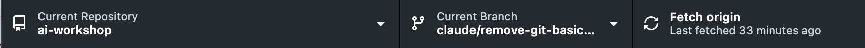 Section titled “Step 1: Open GitHub Desktop”Switch to GitHub Desktop. You should see the above bar at the top. The left-most section is the repository you are on. The middle section is the branch you are on and the rightmost section is the ‘actionable’ section.