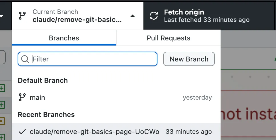 Section titled “Pulling from Origin”After you select the correct branch, you may see a button to “Pull Origin”. Do that. If not click on ‘Fetch Origin’ and wait for the app to check for updates.