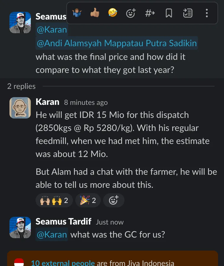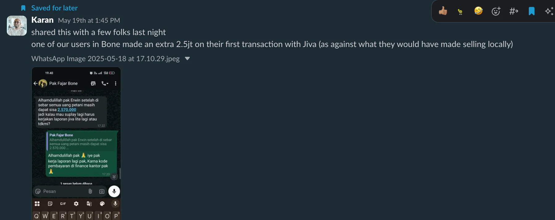 Behaviourally though, we were about to bring meaningful improvements into the lives of the Farmers in a few provinces of South Sulawesi. Most farmers who transacted with us made about 2.5-3 million IDR(~$180 USD) more than they would otherwise. Even after Jiva Lite shut down, a few of the farmers continued to deal directly with the collection centres and improve their collective earnings.